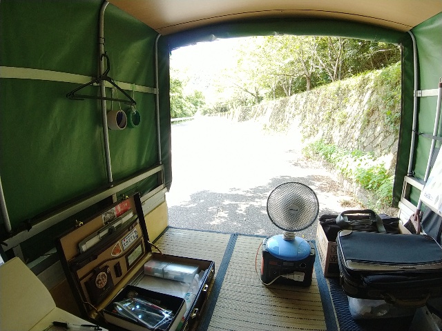 伸びて日陰になる地点を選びました。…扇風機もありますよ。