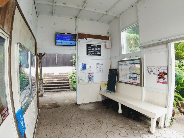 古い木造駅舎が残っており、入口に「すさみ町観光案内所」の看板