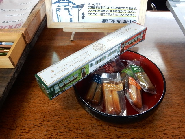 菓子です。3両編成の車両をデザインした箱もお洒落でしょ。