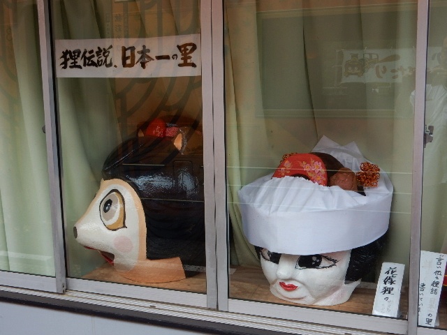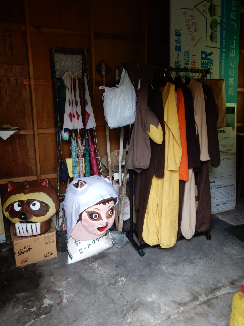 駅務室らしき所の窓にも、妖怪たぬきの張り子のお面などが飾れて