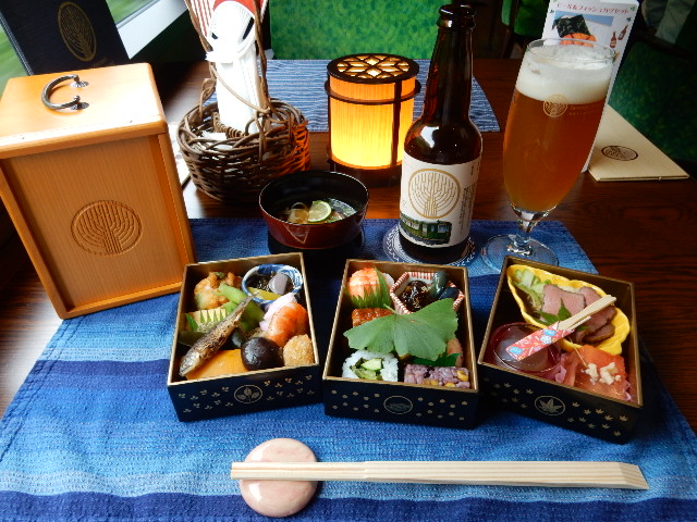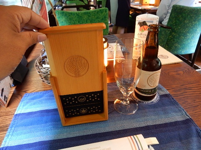 ランチョンマットも藍染めの御当地物で、飲み物は地ビールが注文