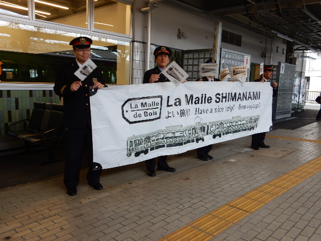 尾道駅でも横断幕を持った駅員さんがお出迎え。…車両のデザインと