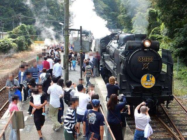 9割程度の乗車率だと思われ、狭いホームが見物人で溢れています。