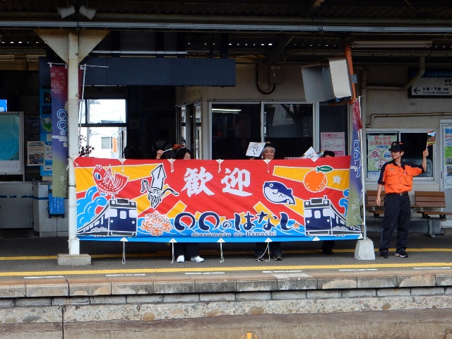 長門市でも駅の皆さんがオリジナルの大漁旗もどきでお見送り。