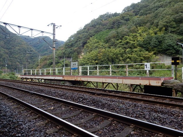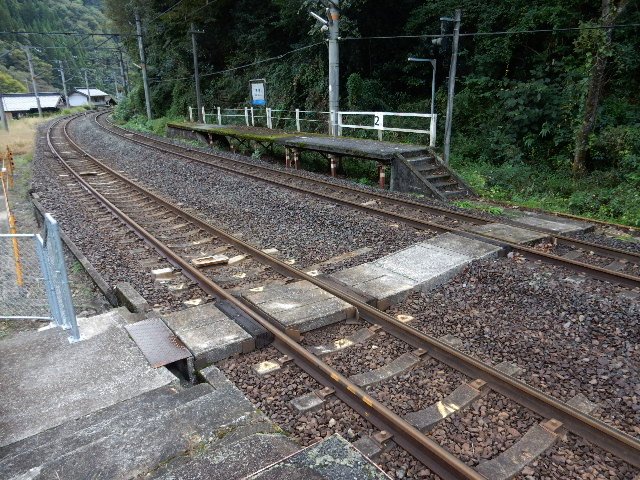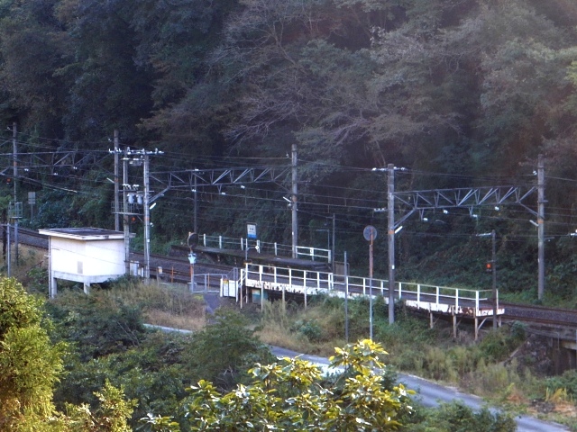 途中の道路から駅が見えますが、山の谷間に作られた信号場の雰囲気