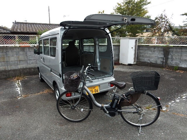 に車を駐めて電動自転車を降ろします。