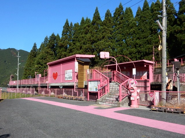 相変わらずド派手なピンク色の駅が、森の中で目立っております。