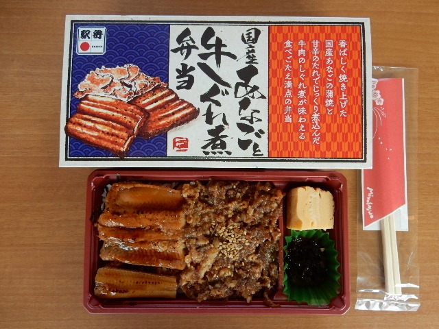 ここらで駅弁の1食目。「国産あなごと牛しぐれ煮弁当」は、社員旅行