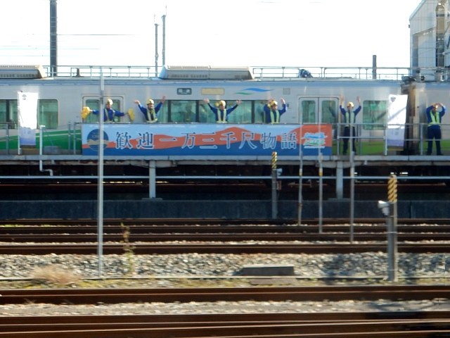隣接しており、職員の皆さんが横断幕でお見送り。最近はコノ手の