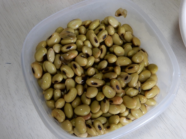 右は「駅の里」で売られていた豆(乾燥品)を、大海駅長が煮込んで