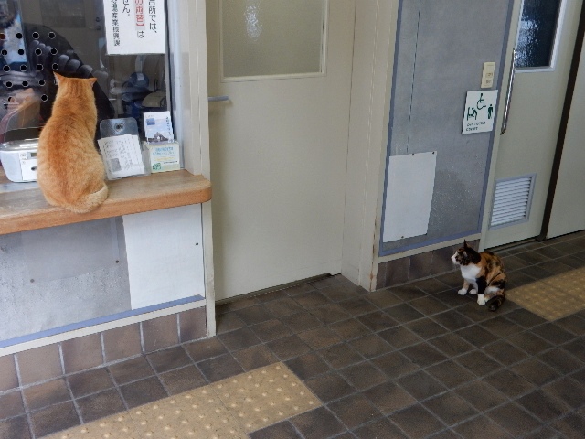 猫が居ますね。駐車場やら切符売場を何匹かがウロついております。