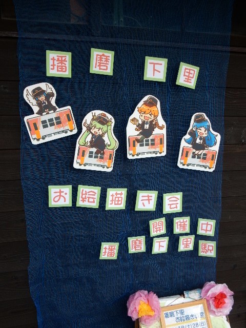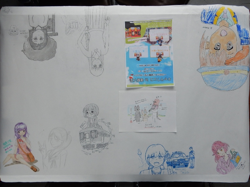 お絵描き教室の作品は、今回は駅舎内のテーブルに大きな模造紙を