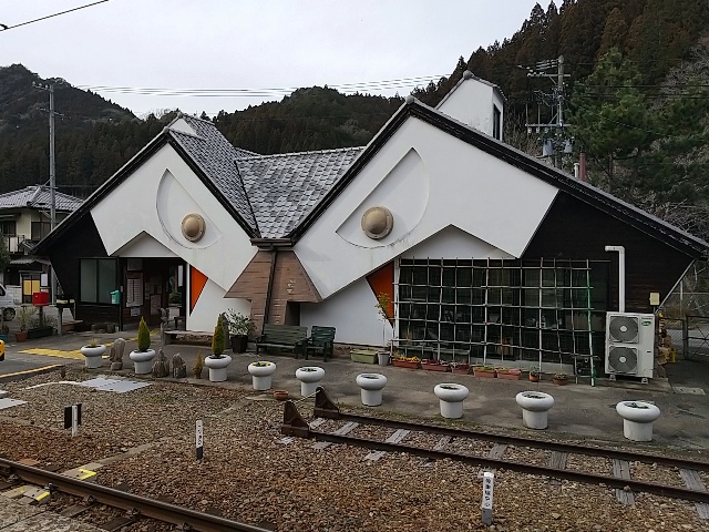 ココで有名なのは、この奇抜な形状の駅舎でしょう。道路に面した