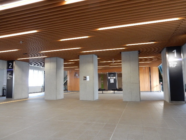 コンコースも新しくて広々としています。格子っぽい木の使い方なのは