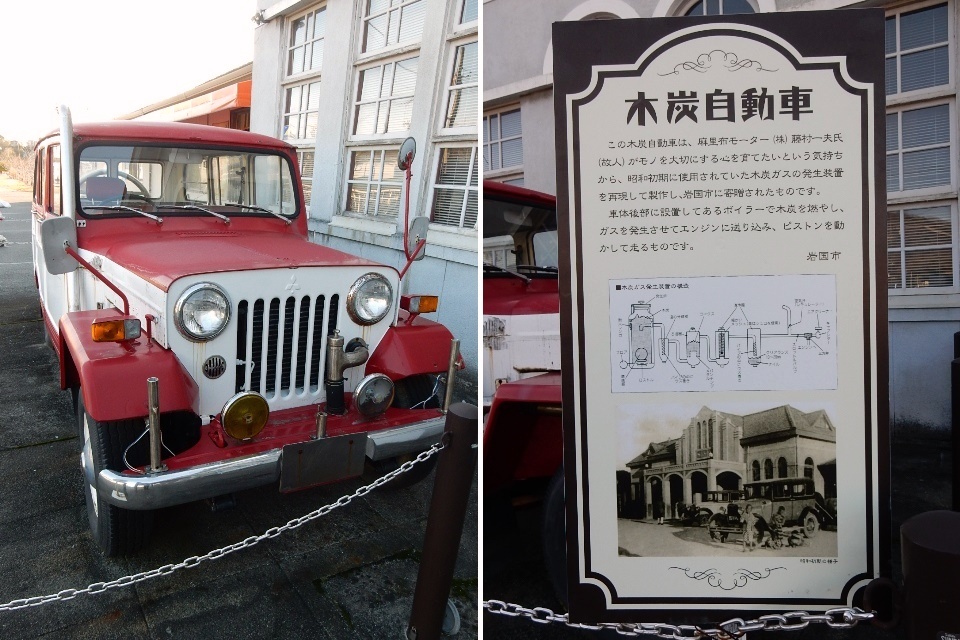 それと駅前には、復刻版だと言う木炭自動車が展示されています。