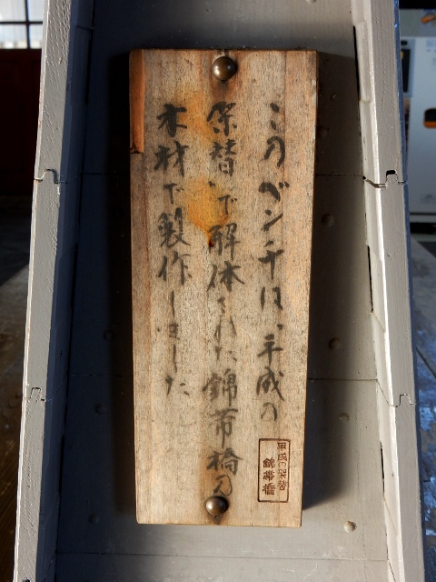 現在の待合室にある木製のベンチは、錦帯橋を架け替えた時に出た