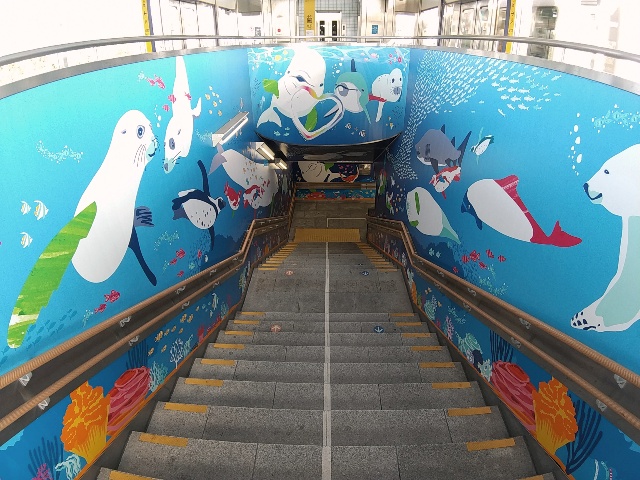 水族館の最寄駅とあって、階段には色々な海洋生物をイラスト化した