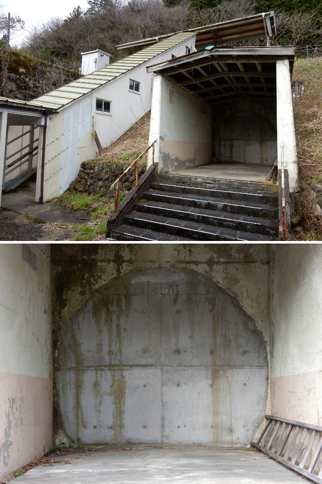 ホームへ通じる階段があって、その右に防空壕みたいな謎の施設が
