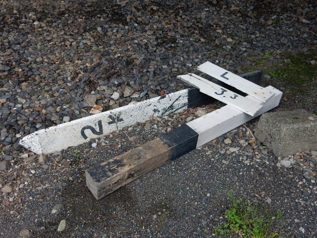 キロポストや勾配票が、引っこ抜かれた状態で打ち捨てられてました。