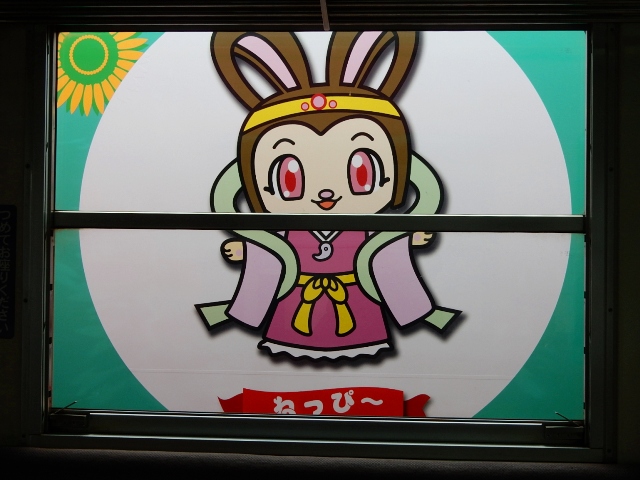 …運用中のピンク色の1号機の窓から見ると、加西市のキャラクターの