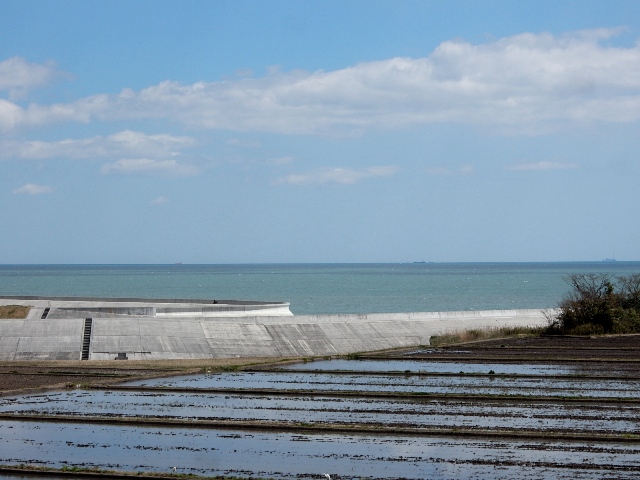 車窓の右手に時々海が見えます。今は穏やかな風景ですが、震災