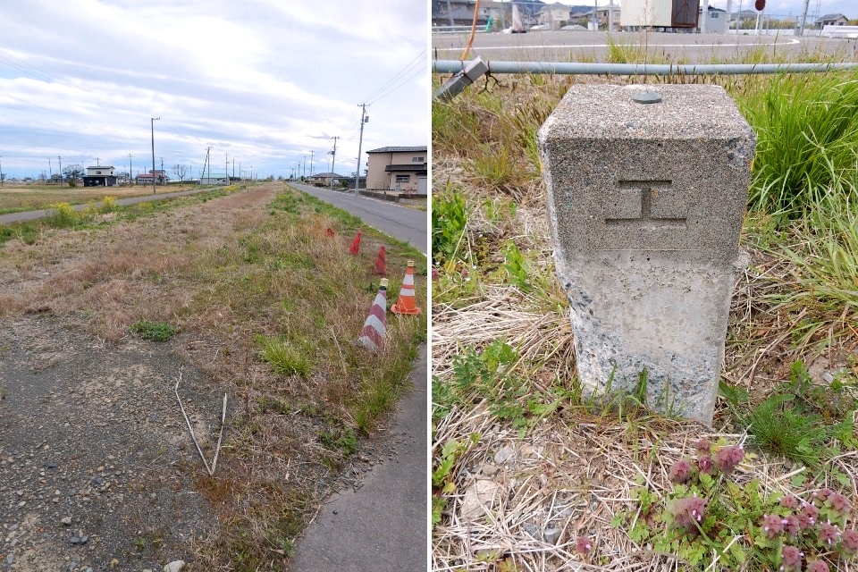付近を探してみると、国鉄の土地との境界を記す「工」マークの杭が