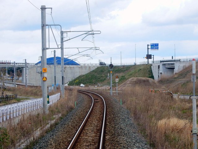 内陸方向を見ると、少し離れた所に新しい常磐線が見えました。