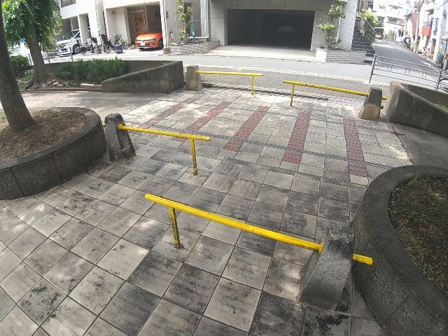 公園の敷地と横の道路を隔てる車止めが、鉄道の遮断機を模した