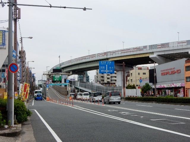 さて南海平野線の跡地を探る旅ですが、頭上にあった阪神高速は右へ