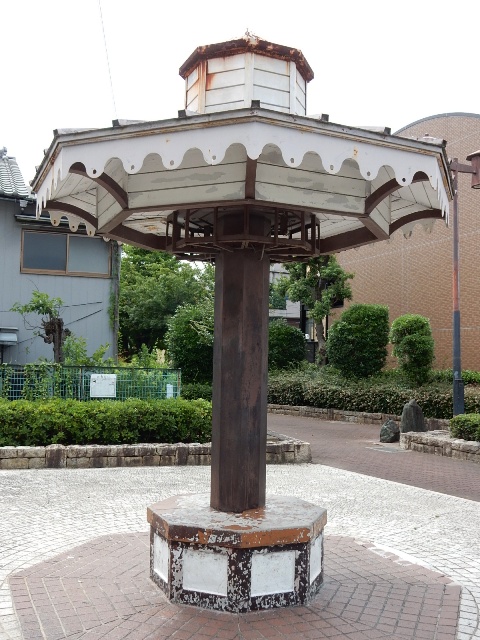 …何やらレトロモダンなデザインの一本足の屋根が付いたベンチが