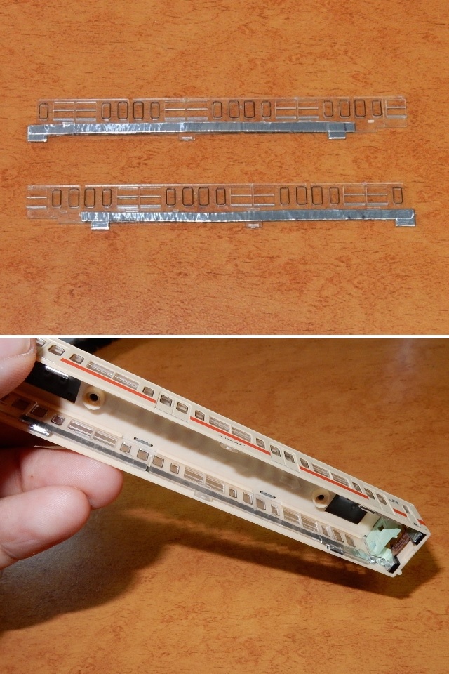 先頭部分にライトの基盤を嵌め込み、左右の窓枠には付属のアルミ