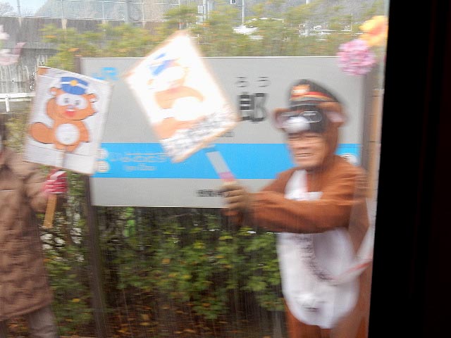 この駅にはパンダの着ぐるみで列車の見送りをする人が居るらしい。