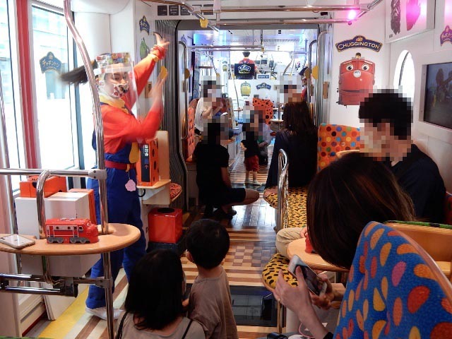 折り返しの車内は、お姉さんの振り付けに合わせて体を動かす時間