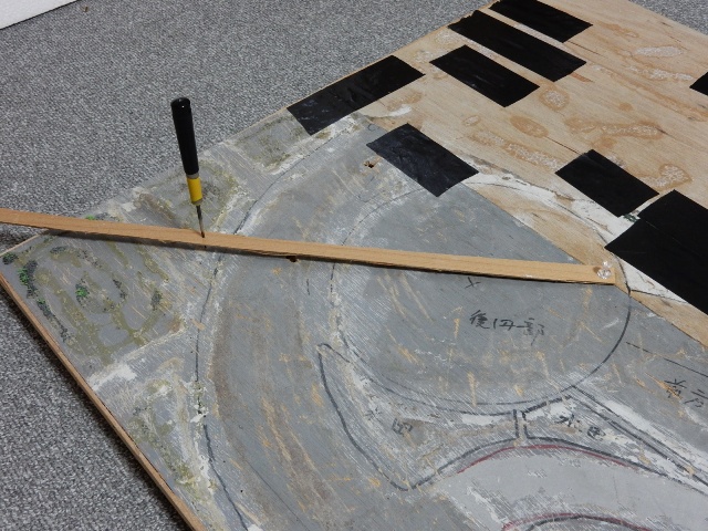 曲線部分は、廃材で単純なコンパスを作って円弧を描きます。