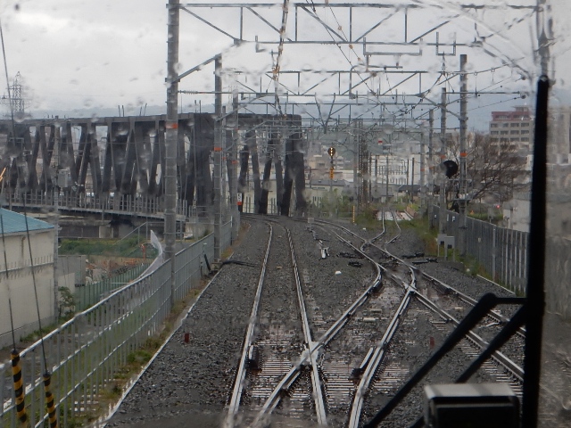 左手の新しいトラス橋を渡って南吹田駅方向。次いで新大阪方面へ