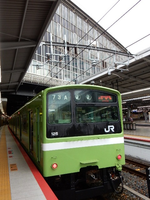 …新幹線の高架が跨ぐ新大阪駅に、ウグイス色の201系が入ってる。