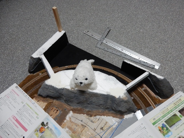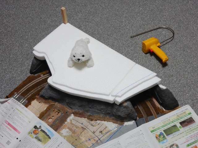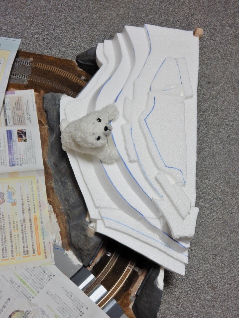 更に発泡スチロールを積んで山の斜面を作って行きますが、途中で