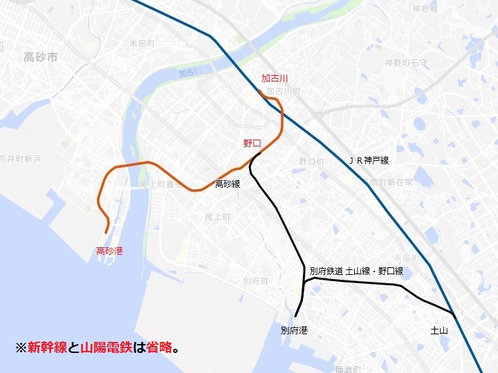 国鉄高砂線は、上記通り加古川から南西方向へ8km程度の路線で、