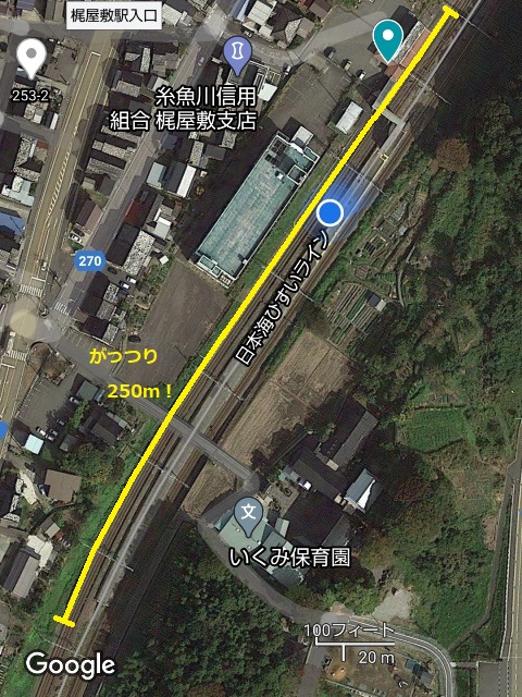 …殊に駅舎側の1番線の方が長く、地図アプリの航空写真で測って