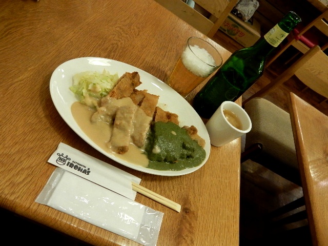 …夕食は「かつめし」にしておきます。緑のソースはバジル風味ですよ。