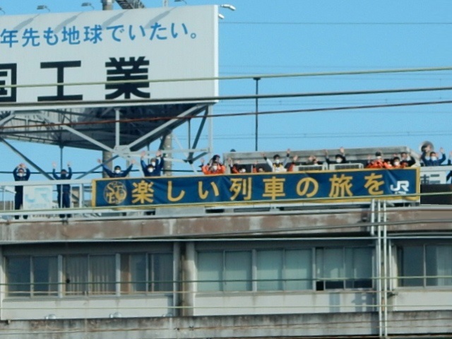 近くの建物の屋上から、社員の皆さんが横断幕を持ってお見送り。