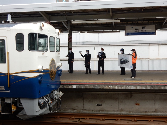 ココでも駅員さんが横断幕を持ってお出迎え。停車時間が長いから