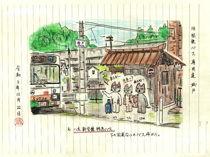 さて絵の方ですが、今回は現在も使われている国道沿いのバス停