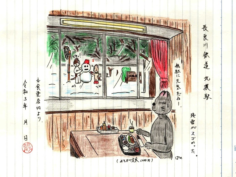 今回は食堂の店内を描こうと思ってたんですが、折角の積雪なので