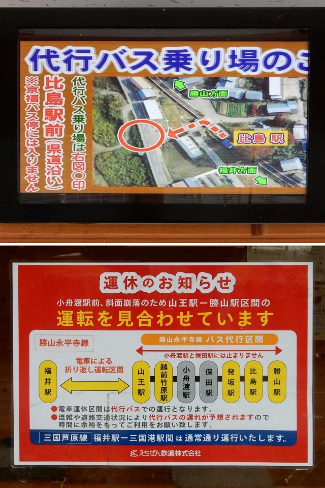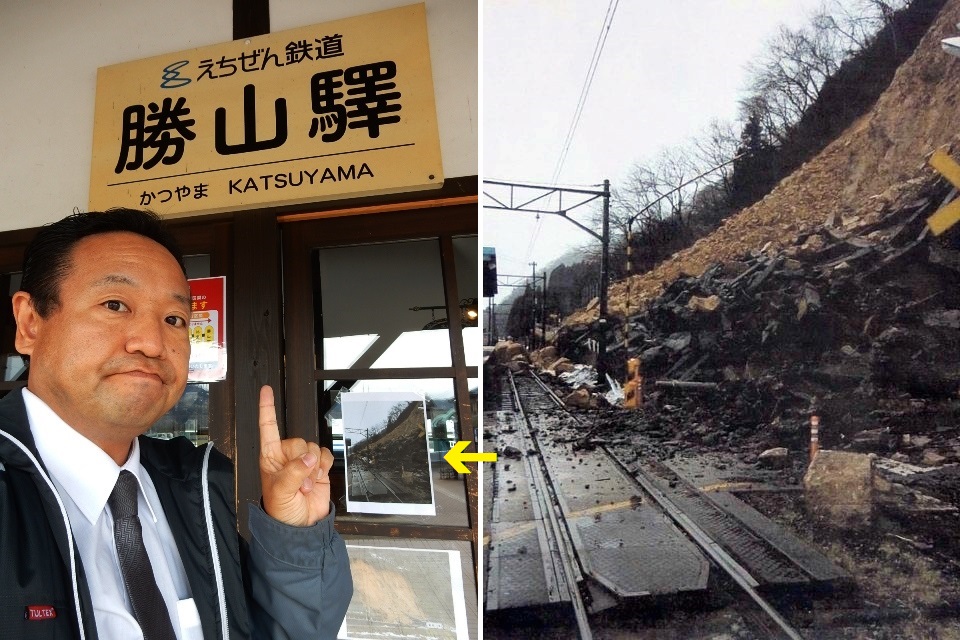 勝山駅の入口に土砂崩れの現場写真が貼ってありますね。…奥手