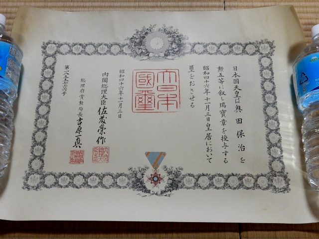 「勲五等瑞宝章」と言う物で、教育関係の功労者(学校の校長先生