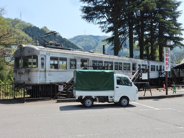 ココの駐車場にある2両編成の電車がソレなのですが、ドコかで見た