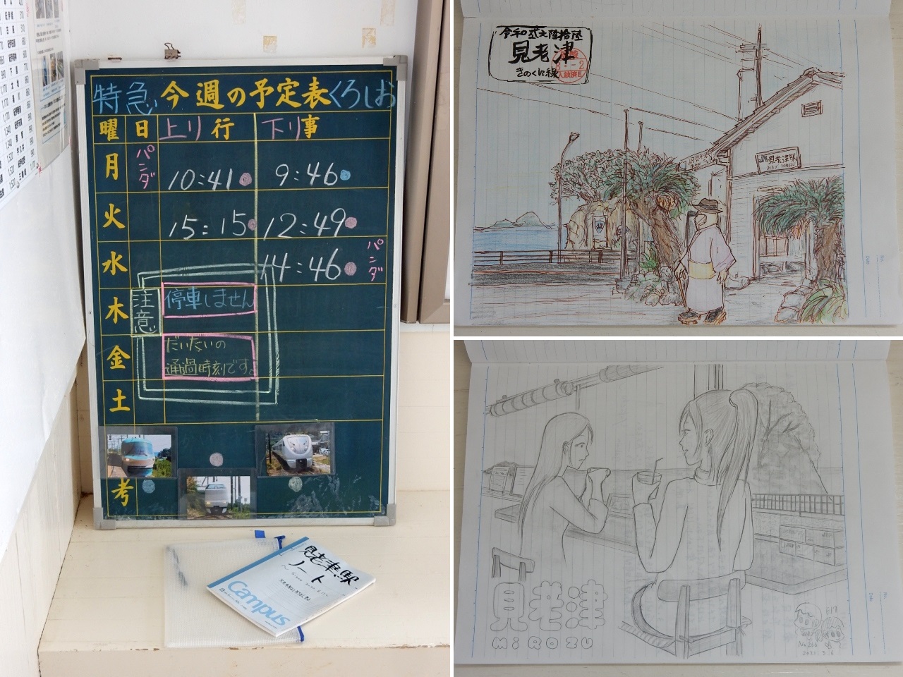 …手書きの黒板で特急「くろしお」の通過時刻が記してありますが、