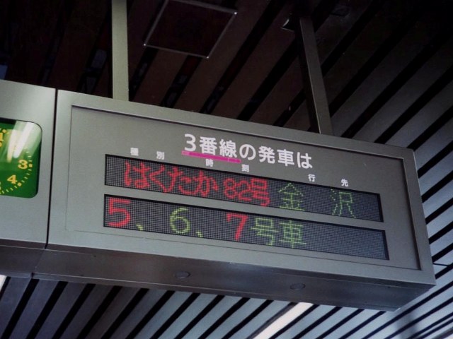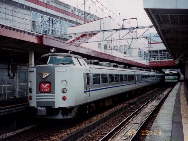 先に定期列車のはくたか号…JR西日本の485系が発車します。