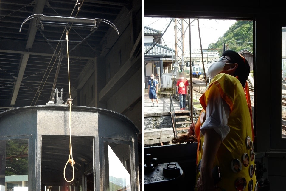 そしてこのテキ6型のパンタグラフは、運転席の窓からロープを引いて